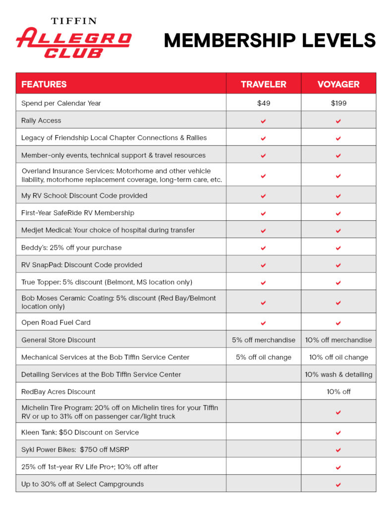 - Exclusive Benefits: As a member of the Tiffin Allegro Club, you gain access to a host of benefits meticulously tailored to enhance your ownership experience. From members-only events to exclusive discounts, each perk is designed with you in mind.